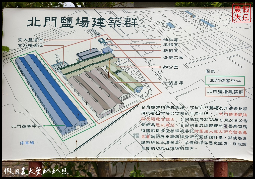 北門鹽場廠房為木構建築,是臺灣日治時期由總督府專賣局所建的四大洗滌鹽廠中唯一僅存者,曾經是臺灣食鹽的主要供應地,也是臺灣產製的加碘鹽之原始工廠。目前轉型為北門遊客中心和北門洗滌鹽觀光工場