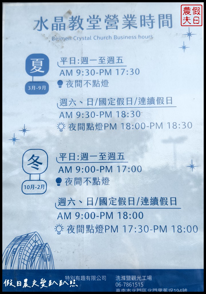 - (一)夏令(3月1日至9月30日):平日營業時間為9時30分至17時30分、假日為9時30分至18時30分,假日18時至18時30分點燈。