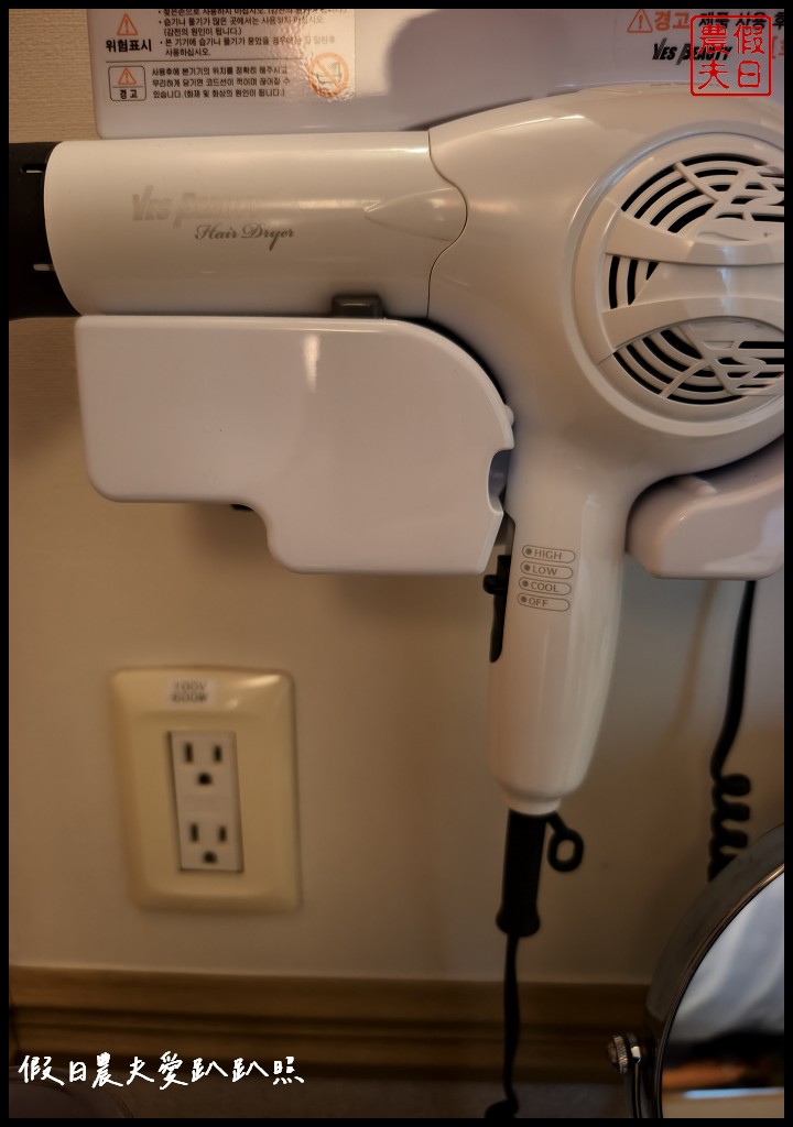 東橫inn釜山中央站房間吹風機下就有110V台灣插頭插座,不需要轉接頭