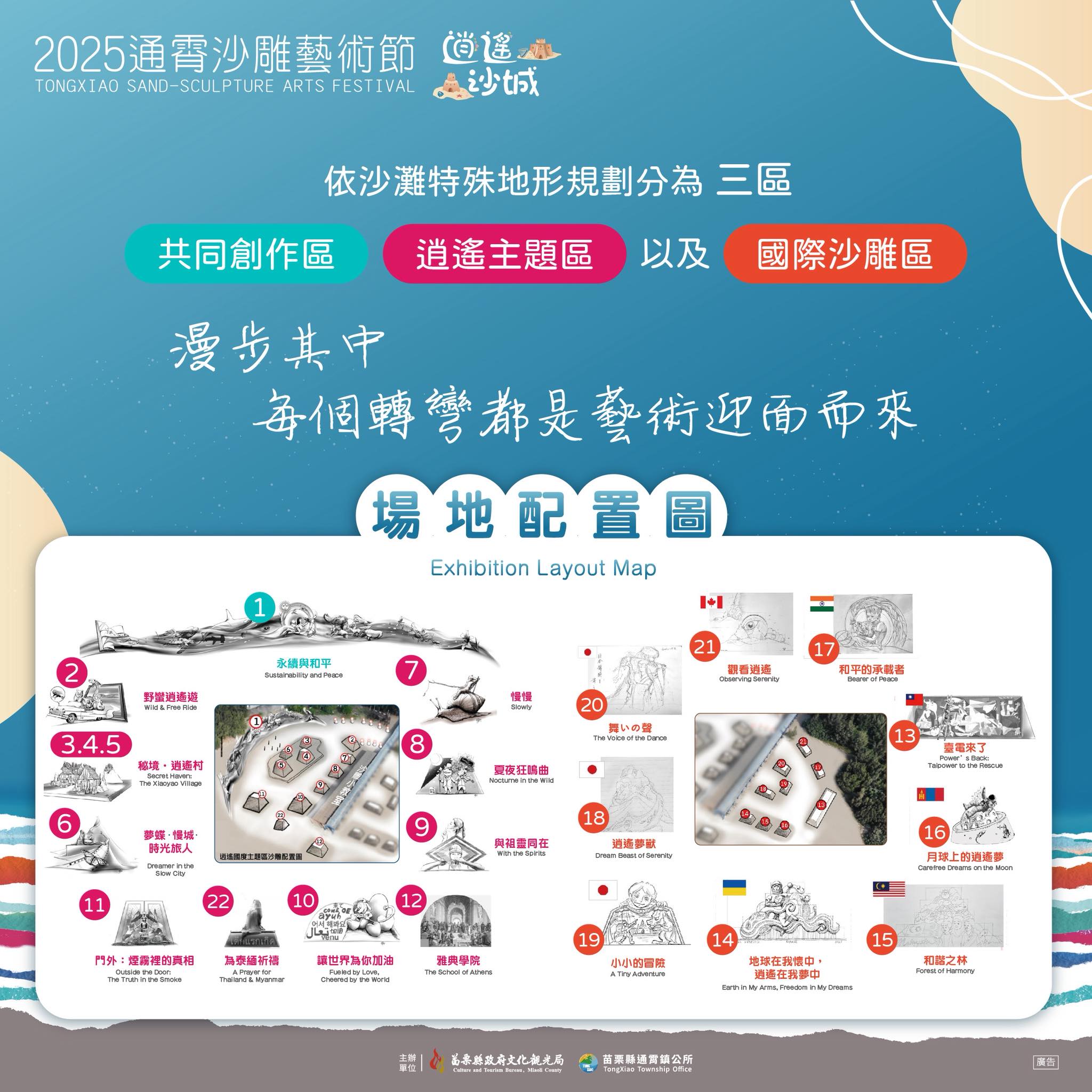 2025通霄沙雕藝術節今年展區規劃「共同創作區」、「逍遙主題區」與「國際沙雕區」三大主題,共展出22座精采絕倫的沙雕作品,作品分布如下圖