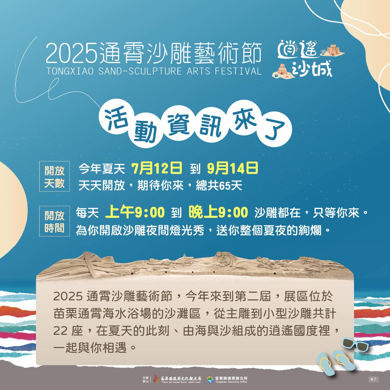 看沙雕不用到台北福隆了,由苗栗縣政府舉辦的「2025通霄沙雕藝術節」特別邀請 8 位來自日本、馬來西亞、蒙古、烏克蘭、加拿大的國際沙雕師,與台灣沙雕團隊一同創作,以「逍遙沙城」為主題,共創作 22 件沙雕作品,其中長達 70 公尺的主雕《永續與和平》必看,細膩地刻劃了海龜、小白鯨、旗魚等海洋生物,即日起至 9/14每日上午9點至晚間9點開放,免費參觀、免費停車,歡迎大家來白天看沙雕、晚上看夜間光雕展演