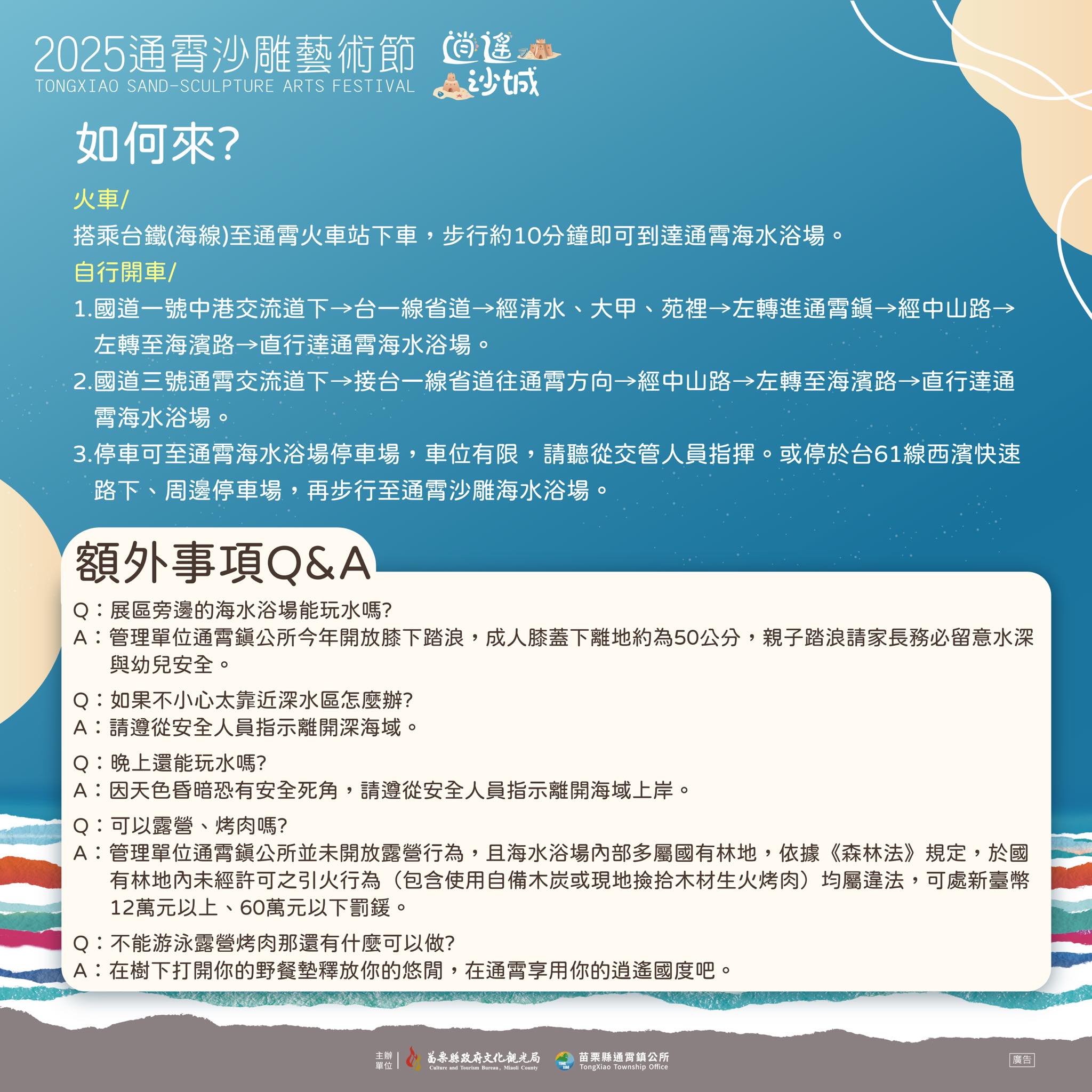 - 搭 5808 至「通霄站」→ 步行 20 分鐘 → 抵達沙雕藝術節活動會場。